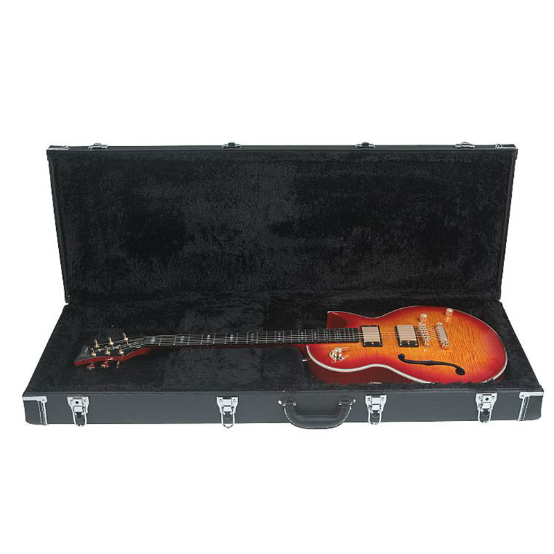 RockCase RC 10727 B/SB. Professional guitar wood case with black Tolex surface material for every AK 1974 Guitar. For ideal instrument protection guarantees the wide neck holder with additional neck cushion and Headstock Support System, as well as a thick foam insert in the middle of the cask cover and the with foam rubber amplified inner edge. The all around sewed interior coating out of long hair plush preserves the damageable instruments finish. Separate interior compartment with cover for storage of different accessories. Massive locks, metal feets and a robust PVC handle care for a stress free handling.