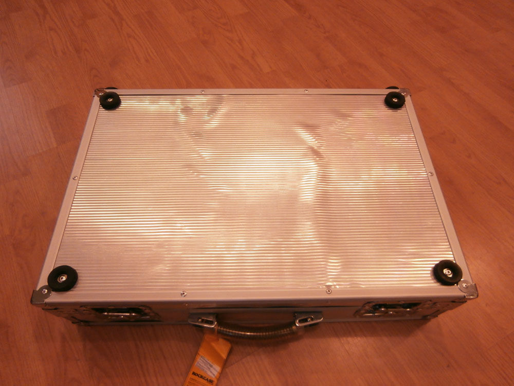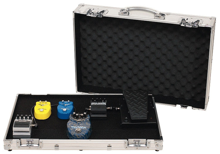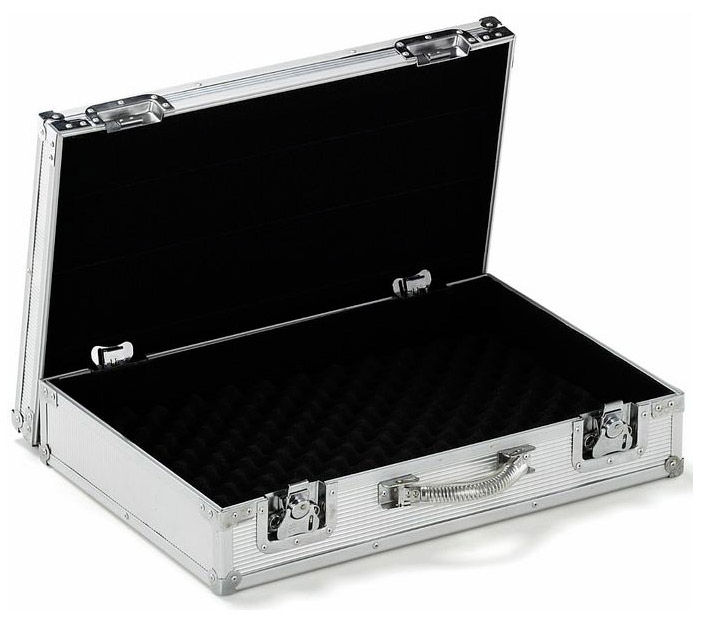 RockCase čvrst aluminijumski kofer, unutrašnjost tapacirana i prekrivena Velcro (čičak) materijalom, sadrži Velcro trake za fiksiranje pedala, 4 hromirane brave.