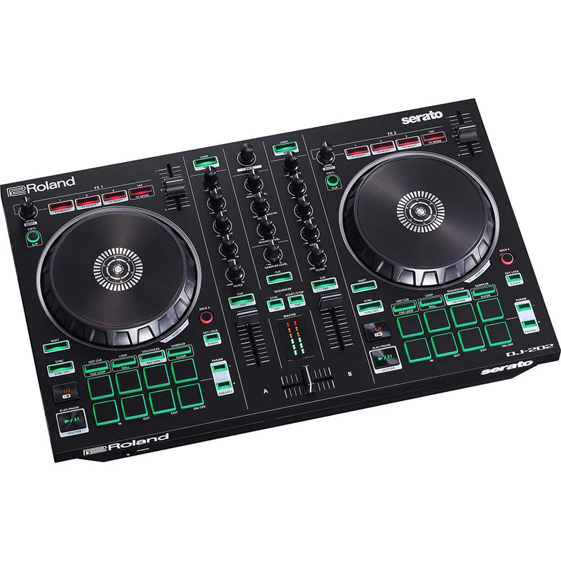 Roland DJ-202 DJ kontroler. The Roland DJ-202 is a forward-thinking Serato DJ Lite controller that gives DJs the features and layout of a full-size professional controller in a rugged and portable unit. The compact DJ-202 preserves the concept of the flagship DJ-808 and streamlined DJ-505. Allowing unparalleled flexibility to DJ, remix, and produce beats on the fly while performing live or creating in the studio. With its large, low-latency platters, dedicated pad and transport controls, onboard sequencer. Mic input with professional vocal FX, the DJ-202 packs in the most features of any controller in its class.