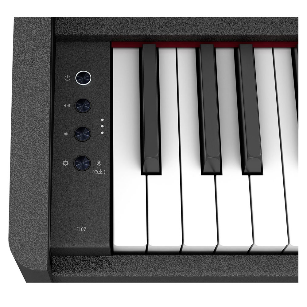 Roland F-107 BKX električni klavir. Slim, stylish, and affordable, the F107 brings exceptional piano performance to your modern living space. Featuring a streamlined design based on the award-winning F701, it blends perfectly with contemporary furnishings. You get best-in-class tone and touch as well, thanks to the same sound engine and keyboard action found in higher-end Roland pianos. And with onboard BluetoothR, you can elevate your musical enjoyment with mobile devices and the companion Roland Piano App.
