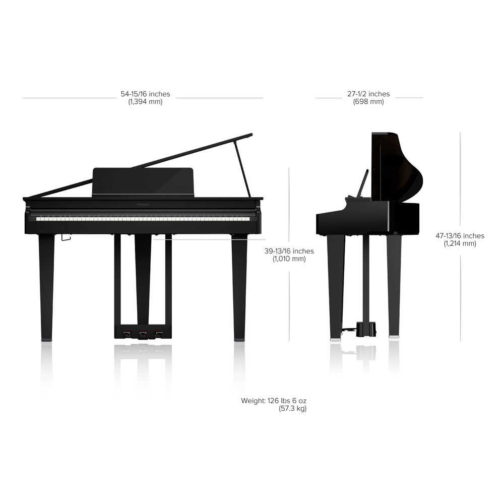 - Compact grand piano with a low-profile footprint and shallow depth (698 mm/27.5 in.) for tight living spaces