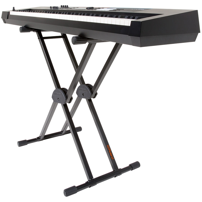 Roland KS-20X stalak. The KS-20X takes the classic offset-X stand design and enhances it with double bracing for increased rigidity. This makes it suitable for all types of keyboards, including large and heavy 88-note models. A spring-loaded lever with locking clutch provides quick and easy height adjustment, while adjustable rubber sleeves provide instrument support and solid stability on uneven surfaces.