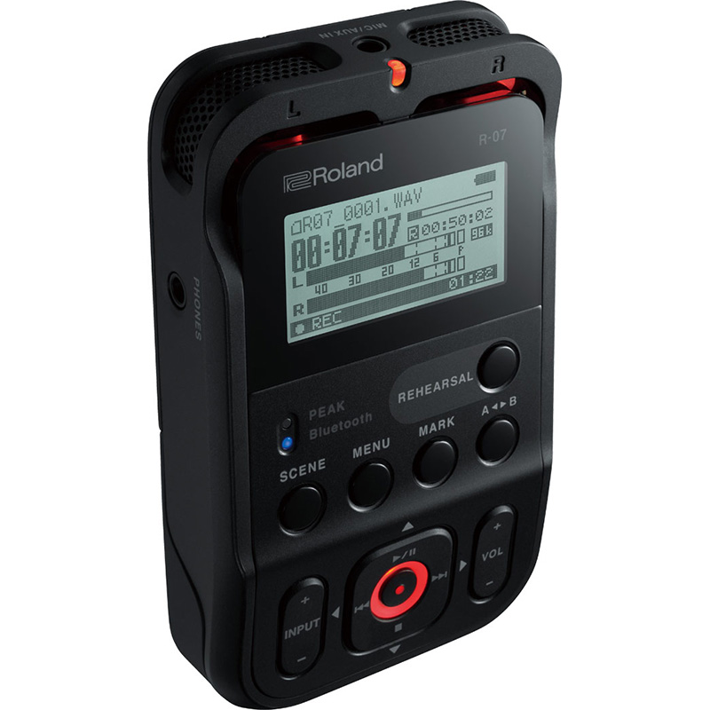 Roland R-07 BK digitalni snimač. The R-07 packs mission-critical recording features into a stylish and ultra-portable device that goes anywhere life takes you. High-resolution audio, one-touch Scene memory, and Hybrid Limiting ensure great sounding recordings no matter what the situation. And wireless listening and remote control mean you can record with less wires in more places. While a smartphone can cover some basic recording situations, for reliable and professional results you really need a dedicated recorder. But a lot of recorders are bulky, complicated, and require an array of wires and adapters. The R-07 is simple and intuitive, goes anywhere, and provides mission-critical recording functions leaving your phone free to do what it does best. The R-07 looks great, sounds superb, and fits comfortably in your hand or your pocket. It's easy to use yet provides truly professional results with one-touch recording setup. Its next-generation Bluetooth capabilities mean you can control, monitor and listen back wirelessly using supported smartphones, smartwatches and Bluetooth speakers. It comes in three stylish colors and runs on two AA batteries or USB bus power.