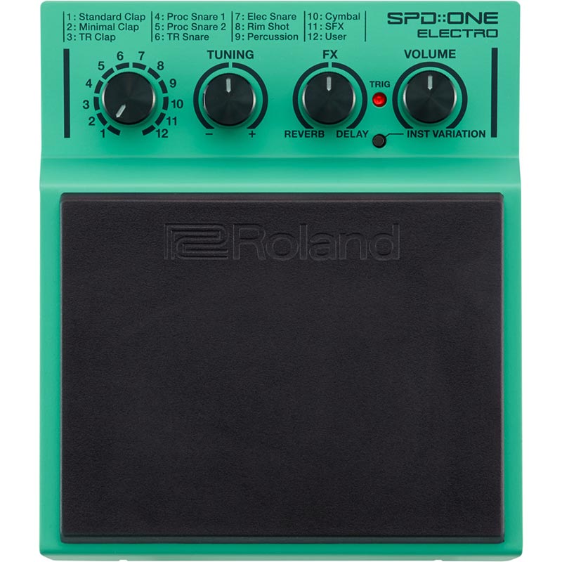 Roland SPD-1E Percusion Pad. The Roland SPD::ONE ELECTRO is a new type of digital percussion pad, one that allows any musician to add electronic sounds to their performances. It contains 22 iconic sounds, including fat snares, crisp hand claps, electronic cowbells, and more. You can even import your own original audio data into one of the 12 internal sound banks. The SPD::ONE ELECTRO's robust-yet-sensitive pad can be played with sticks, hands, or feet, and the trigger threshold settings are easily adjusted with intuitive controls. Powered by batteries or AC. The portable SPD::ONE ELECTRO can be used on the floor or a tabletop. Mounted to any rig or drum setup with the included adapter. Operation is simple. Even for those musicians who are not technical; just by using four knobs on the control panel, you can change the sound, volume, balance, and more. Whether you're a drummer, percussion player, guitarist, DJ, or vocalist, the SPD::ONE ELECTRO is a simple and flexible way to expand your sound palette and invigorate your performances.