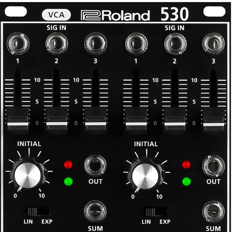 Roland SYS-530 Dual VCA. Based on the classic SYSTEM-100M modular synthesizer. SYSTEM-500 is a fully analog recreation of one of the most revered electronic instruments of all time. Newly designed in Eurorack format. SYSTEM-500 delivers the classic character and functionality of the original with the advantages of a modern instrument. The SYSTEM-500 is made to exacting standards with top-quality components and solid controls, with a collaborative production process between Portland, USA and Hamamatsu, Japan. And it’s surprisingly affordable, turning the fantasy of finally owning this legendary instrument into reality. The 530 Dual VCA (voltage controlled Amplifier) features two independent voltage controlled amplifiers for controlling the loudness of audio signals. Each VCA has three sliders for an audio input mixer, three sliders to mix CV inputs, and a selector switch for linear or exponential response modes.