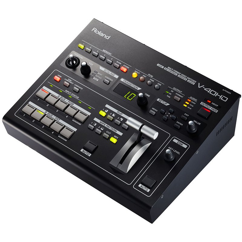 Roland V-40HD Multi-Format Video Mixer. Roland V-40HD Multi-Format Live Video Switcher je najnoviji predstavnik moćne serije miksera kao što su V-1600HD i V-800HD. V-40HD Live Video Switcher je savršen za bilo koji posao u kojem je potrebno miksati slike sa raznih izvora, bilo digitalnih ili analognih, kompjuterskih ili video. Posebna mu je prednost što omogućuje priključivanje HDMI uređaja, kao i kompjutera. Roland V-40HD Multi-Format Live Video Switcher je najnoviji predstavnik moćne serije miksera kao što su V-1600HD i V-800HD. V-40HD Live Video Switcher je savršen za bilo koji posao u kojem je potrebno miksati slike sa raznih izvora, bilo digitalnih ili analognih, kompjuterskih ili video. Posebna mu je prednost što omogućuje priključivanje HDMI uređaja, kao i kompjutera.
