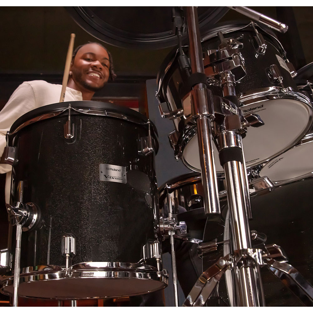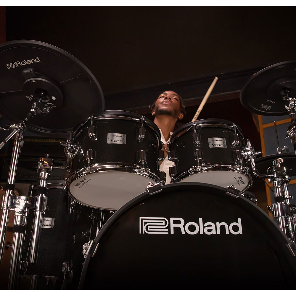 Roland VAD-507 drum set. The VAD507 delivers the commanding presence of a full acoustic drum set on stage—with the convenience and control of electronic drums. This premium five-piece kit features wood shells with full depth and diameter.
