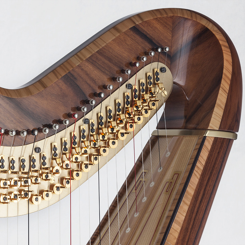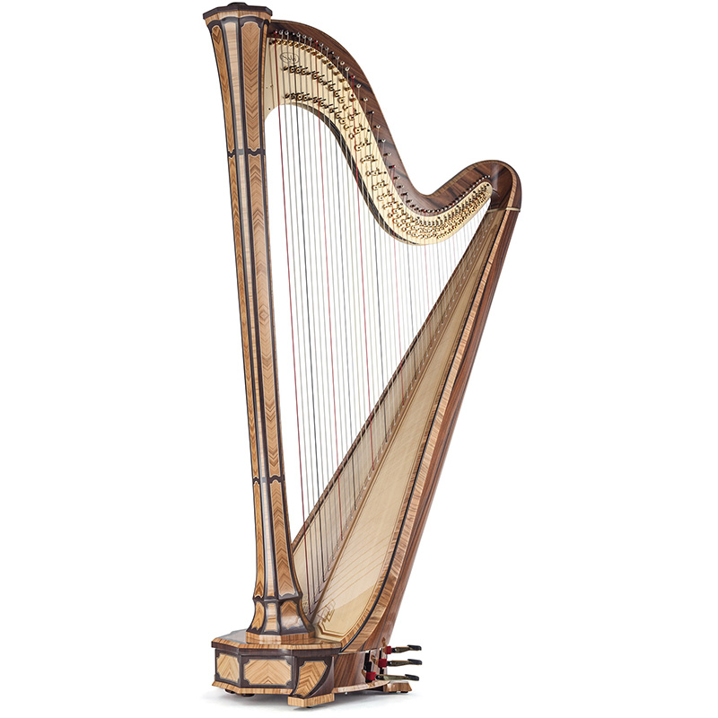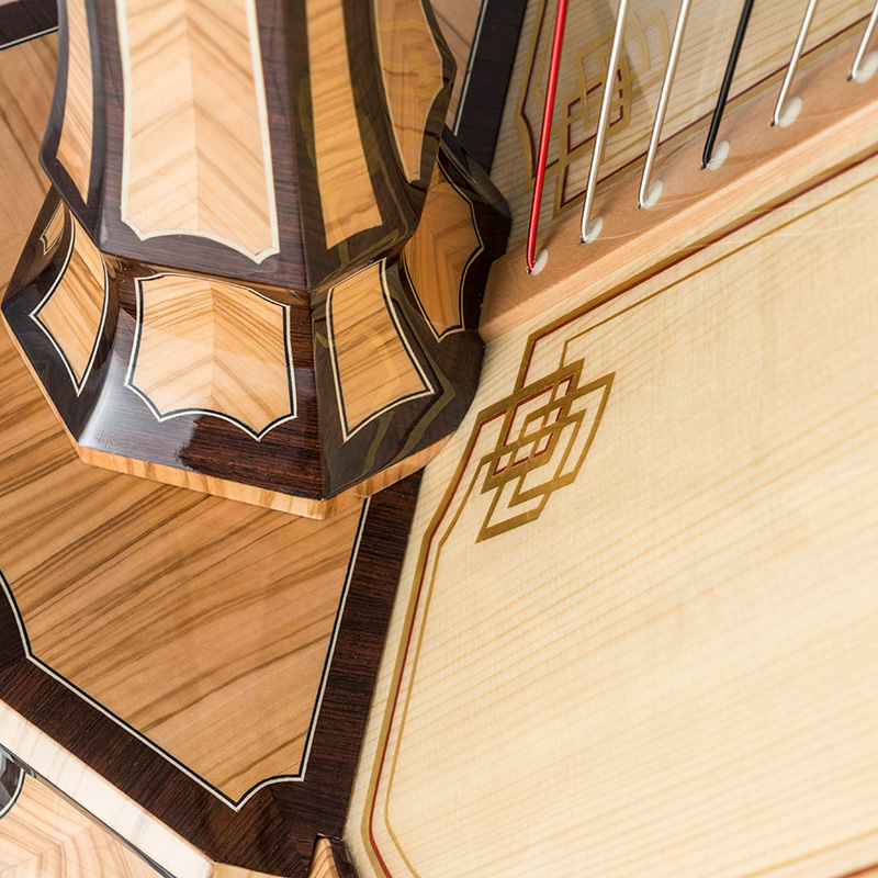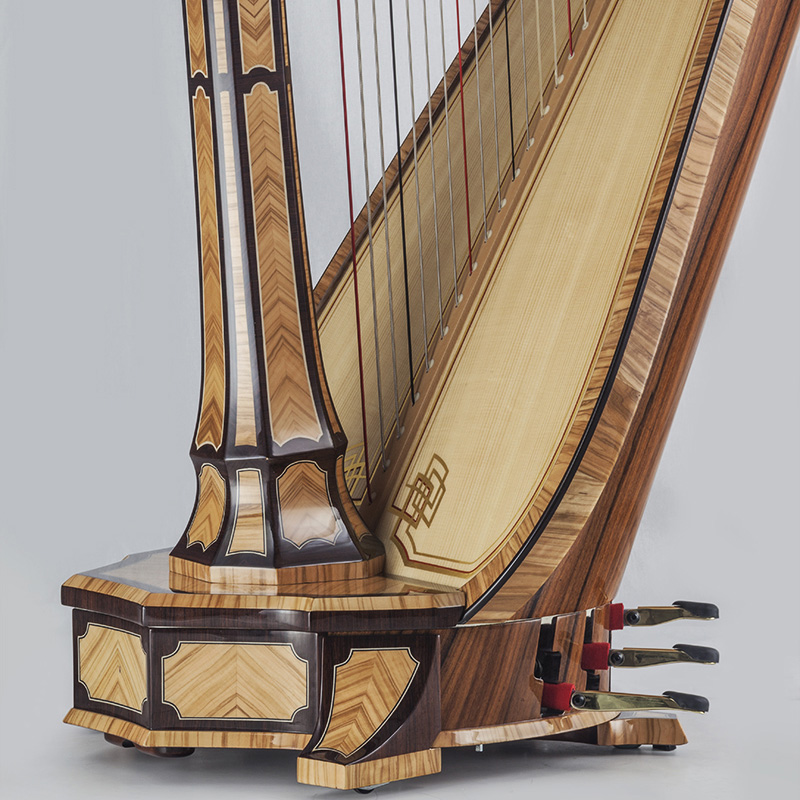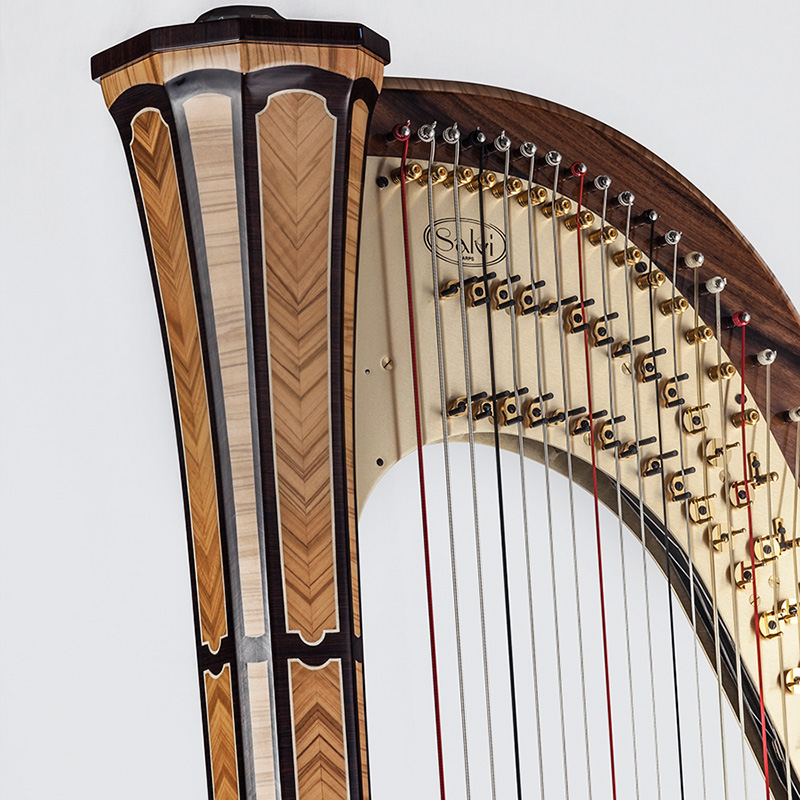 Eye-catching woods are selected from all corners of the globe for these splendid inlays: from rosewood to olive, from ebony to maple. A harp as magnificent and original as its sound.