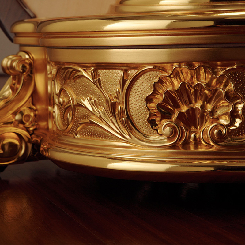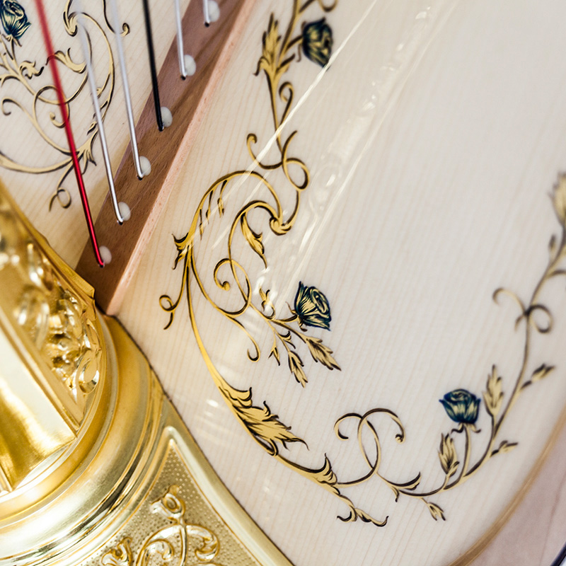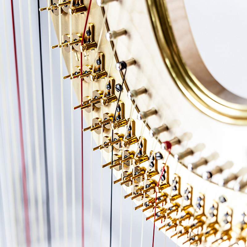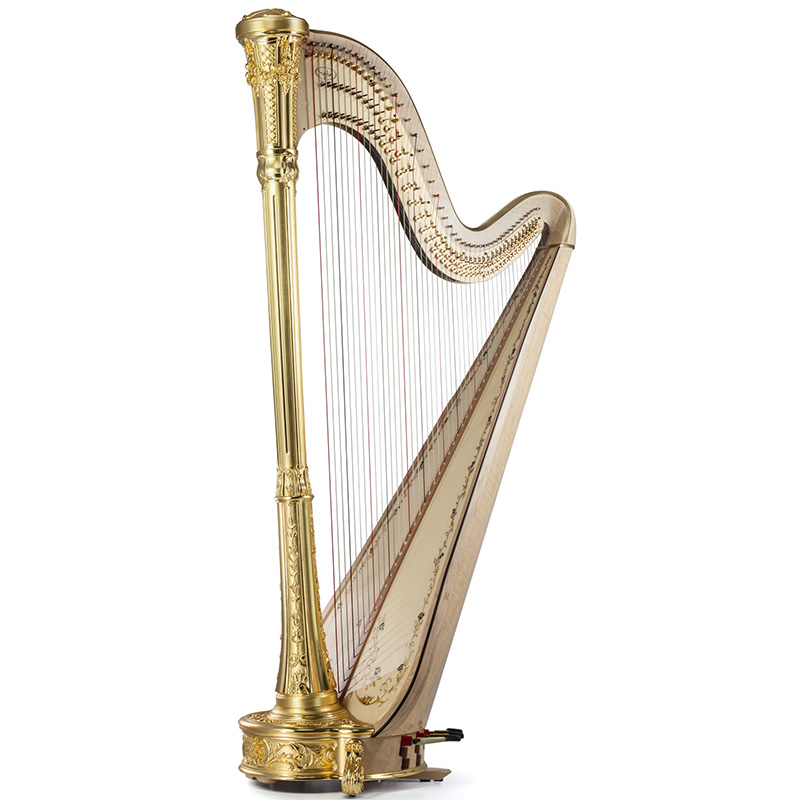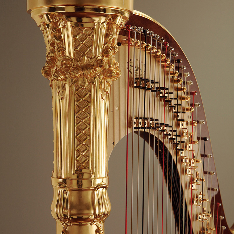 This majestic harp is finely sculpted and glows in the light of 23-carat gold. A resounding timbre and captivating aesthetics make this prestigious Salvi harp the ideal instrument for orchestras and discerning soloists. A limited edition work of art, unique and inimitable.