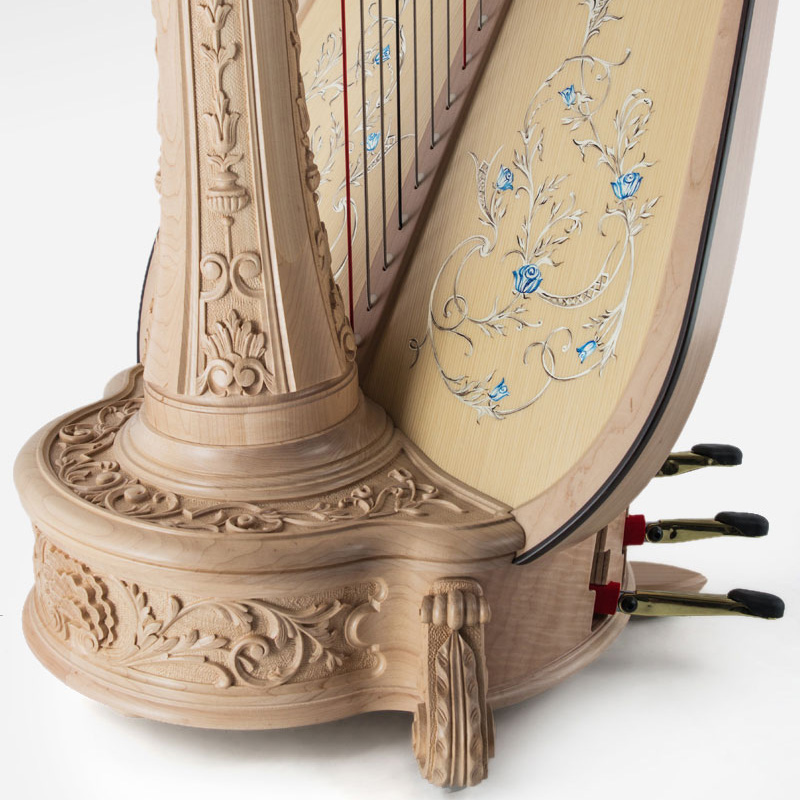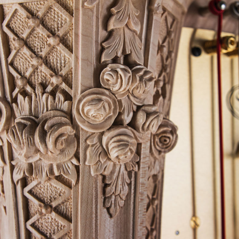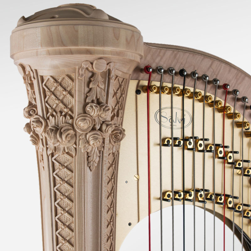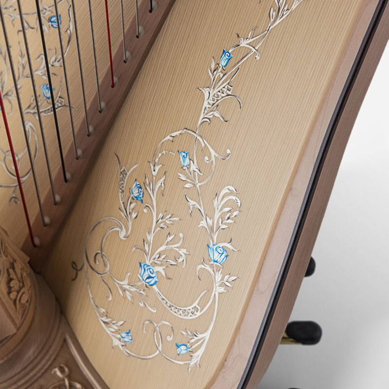 Art, music, design, research, summing up a perfect harmony in the Iris Natural. The finesse of the sculpture enhances the natural beauty of the wood and gives style and personality to this harp. Beauty is combined with excellent performance. The tonal richness and extraordinary sound projection make it the ideal harp for soloists and orchestras.