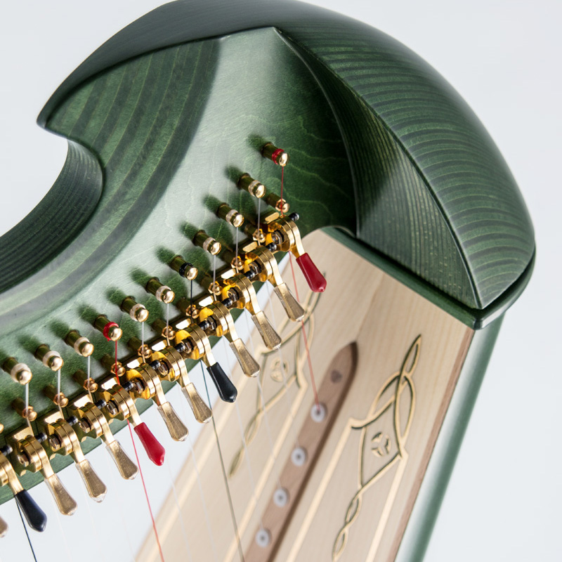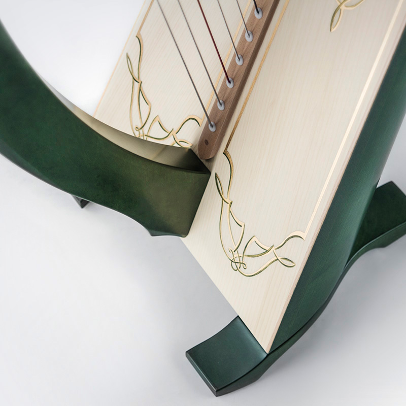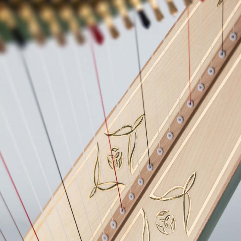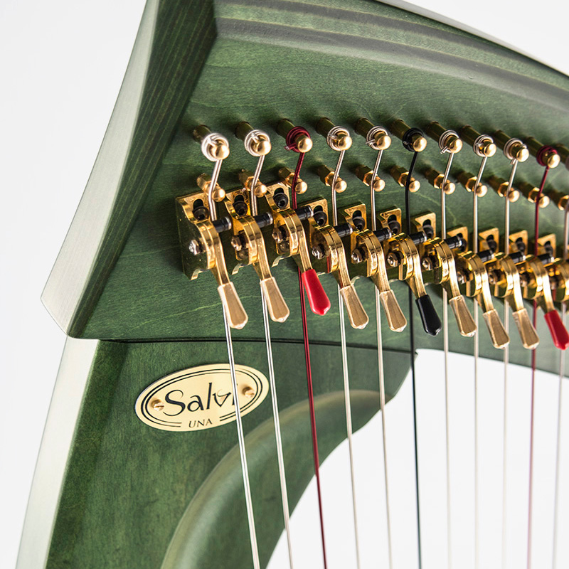 The Una Deluxe is enriched by a stylish soundboard decoration and 24kt gold-plated mechanics. Lightweight and portable, the new 38-string Una Deluxe features a sophisticated and captivating Celtic design. Its unique Silkgut® Copper strings containing copper powder from 4th octave B to 5th octave D remove any musical “jump” from wire to non-wire strings, and lend to the Una Deluxe’s indulgence of rich tones and deep bass.