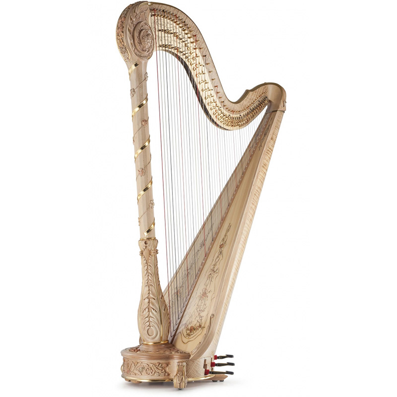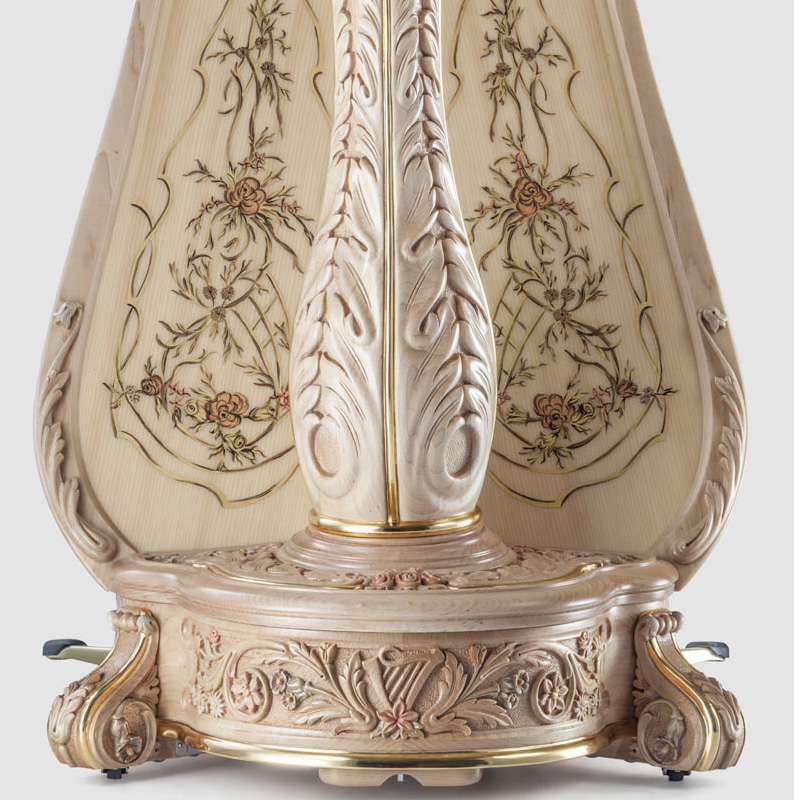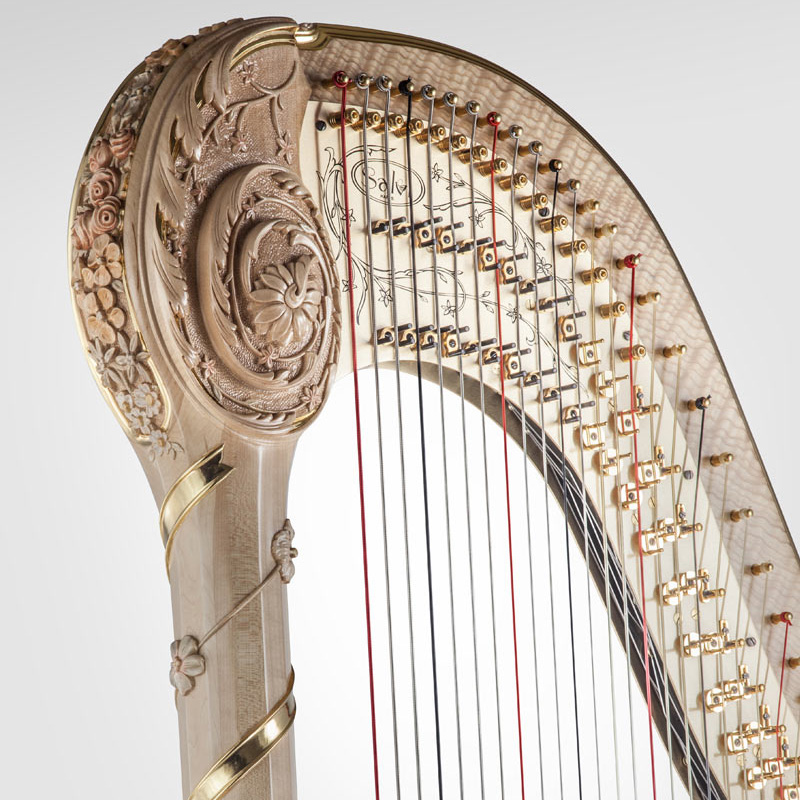 Gold, Canadian Hard Maple and skillful manufacturing make Victoria Gold an authentic work of art. Dedicated to its inspirer, Victor Salvi, every cell in this instrument represents a celebration of the very concept of the harp. With a great Rococo crown, the delicate floral decorations and motifs evoke nature in the classic style, Victoria is a single piece of unique beauty and gushing sound, also available in the Natural version.