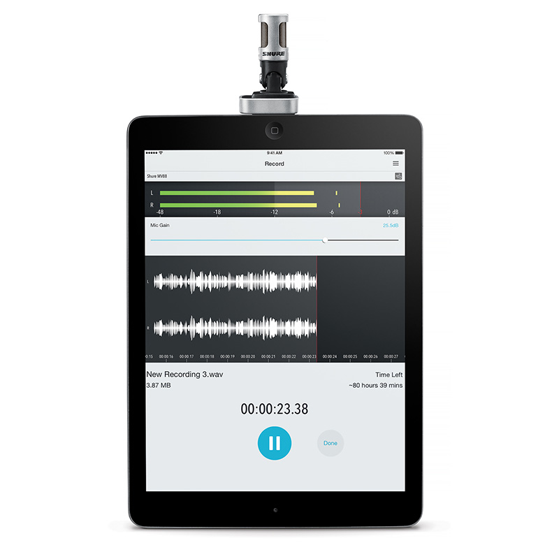 The MV88 iOS Digital Stereo Condenser Microphone offers content creators unrivaled convenience and professional-quality audio on the go. Simply plug it into your iPhone, iPad, or iPod* and hit Record in your favorite audio or video recording app to get life-like stereo recordings. Or, personalize your sound with enhanced control over stereo width, polar patterns, EQ, and more with the free ShurePlus MOTIV Mobile Recording App, which features recording, editing, and the option to share your recordings with the world. Create, capture, and share your way, anywhere.