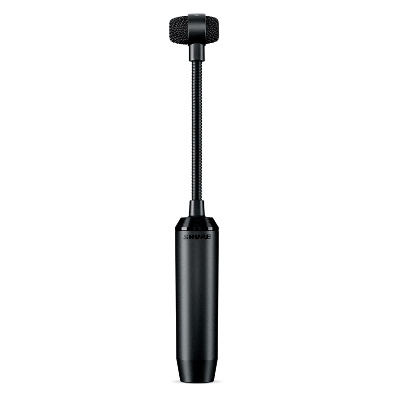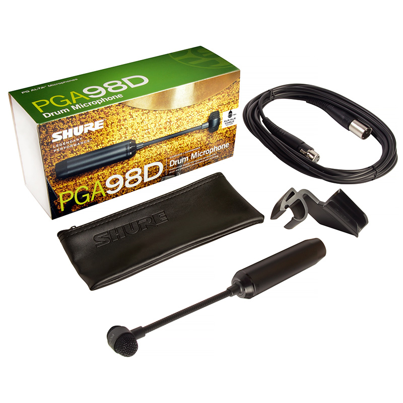 The PGA98D is a professional quality drum microphone with an updated industrial design that features a black metallic finish and grille offering an unobtrusive visual presence. Legendary Shure quality construction ensures exceptional performance in rigorous environments. Additional features include a tailored microphone cartridge design for clear reproduction of drum and percussion sound sources. Cardioid condenser drum microphone delivers clear reproduction of rum and percussion sound sources. The product includes drum mount, zipper pouch, a flexible gooseneck design and an integrated preamplifier for phantom power and XLR connection.