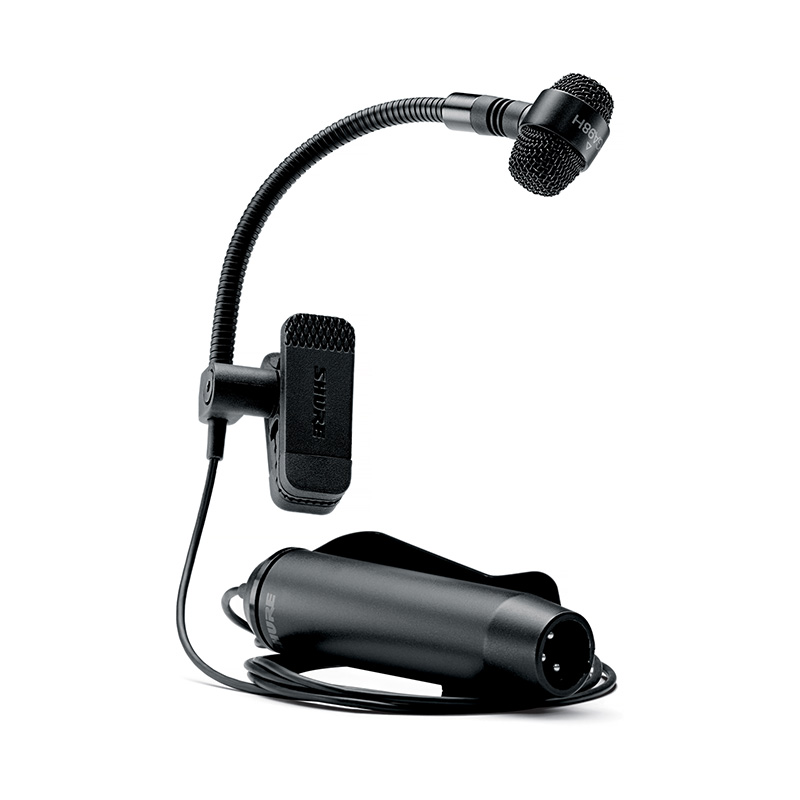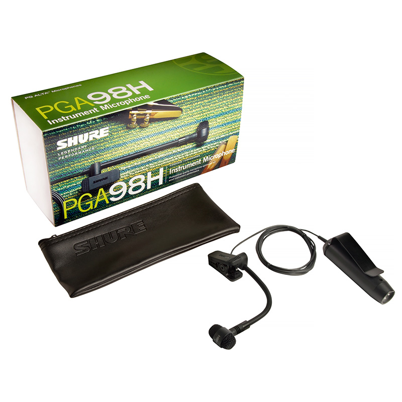The PGA98H is a professional quality wind instrument microphone with an updated industrial design that features a black metallic finish and grille offering an unobtrusive visual presence. Legendary Shure quality construction ensures exceptional performance in rigorous environments. Additional features include a tailored microphone cartridge design for clear reproduction of wind instrument sound sources. Cardioid condenser instrument clip microphone provides clear reproduction of wind instrument sound sources. The product includes an integrated horn clamp, a flexible gooseneck design and a preamplifier for phantom power and XLR connection.