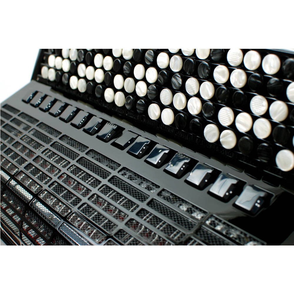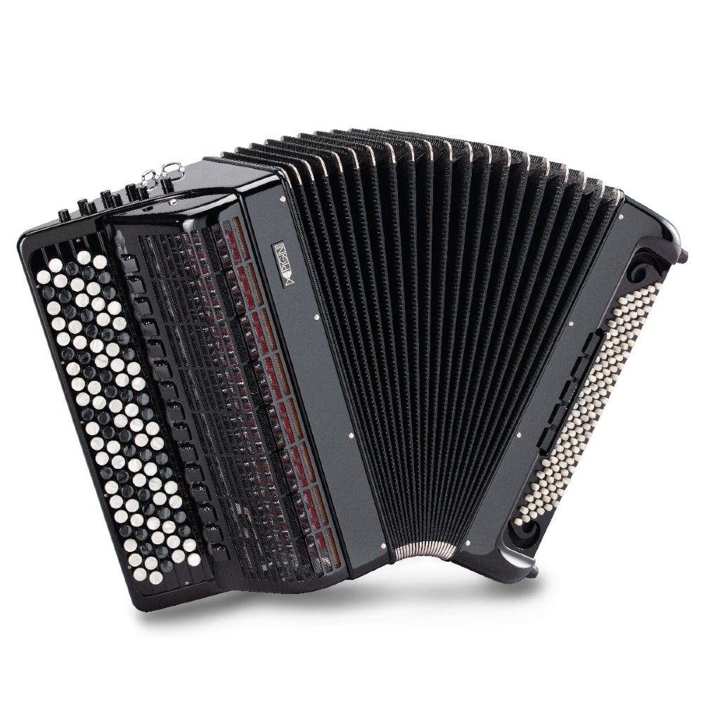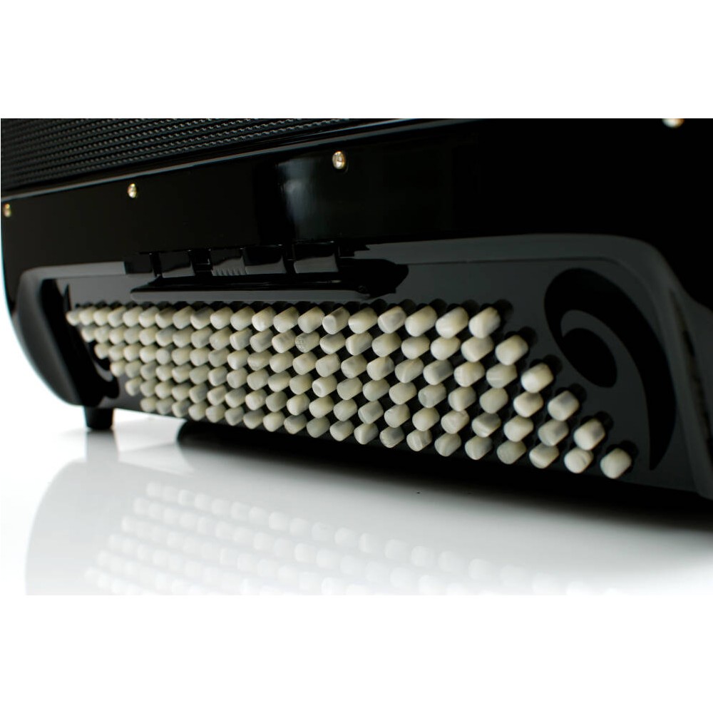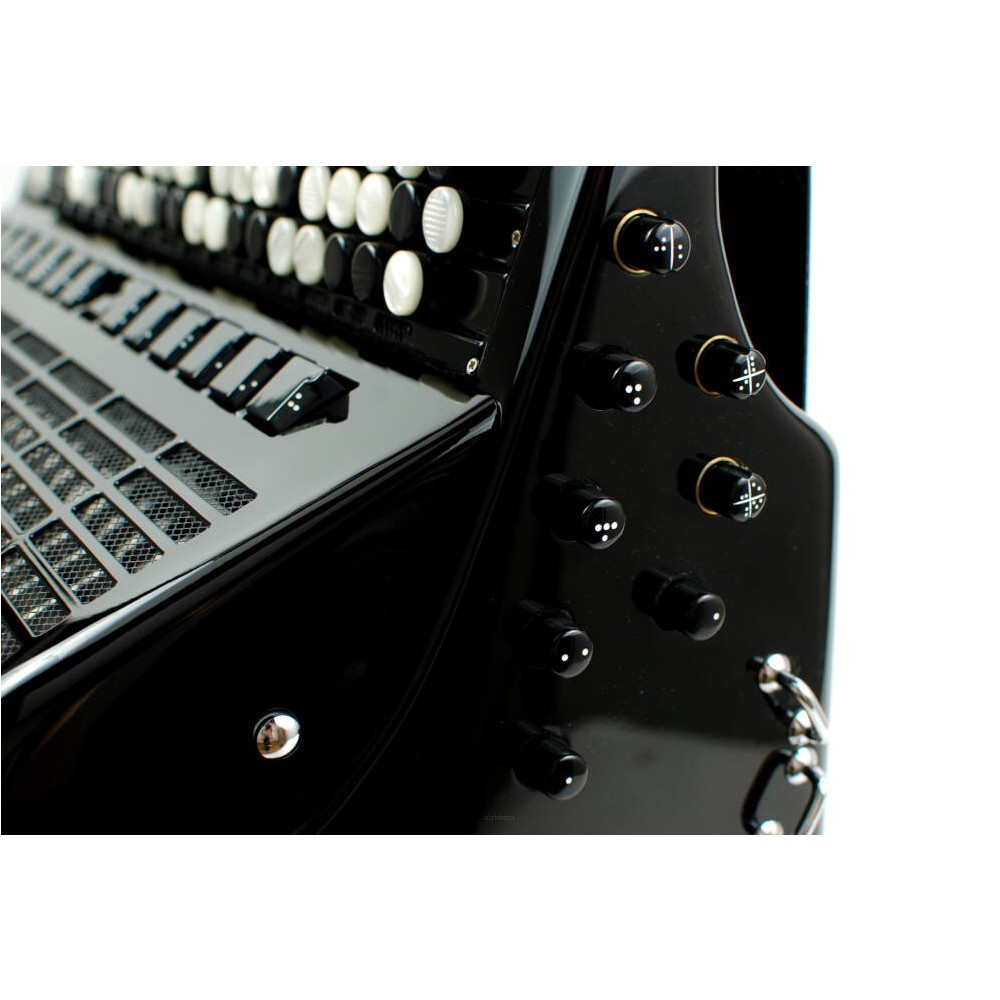 TECHNICAL SPECIFICATIONS RIGHT HAND Notes/Keys: 47 (D#/C#) - plain white color Chorus: 4 Reeds: 16c+8c+8+4 Cassotto: 2 Registers: 15 on the grill Chin switches: 3 + 2 special multi chin switches with 4 registers each (11 chin switches in total as per standard layout) LEFT HAND Free bass notes: 58 (E/C#) Free bass Chorus: 3 (8+8+2 or 8+4+2) Free bass Registers: 5+R or 7+R Standard Bass: 120 – white pearl color Standard bass Chorus: 7 Standard bass Registers: 5+R or 7+R Sizes 48.5 x 23.5 cm Net weight 14,3 kg (please note that it may range up to +/-12% due to the use of the natural materials) FURTHER TECHNICAL FEATURES: • black body colour • C-system or Russian system at left hand • pitch 442Hz • tremolo dry tuned • standard register at right hand • C+F marked at right and left hand Standard bass Bass: 120 Chorus: 7 Registers: 5+R Standard Bass: 120 – white pearl color Standard bass Chorus: 7 Standard bass Registers: 5+R or 7+R