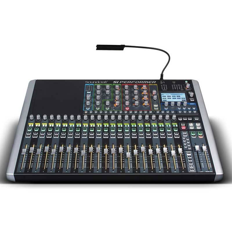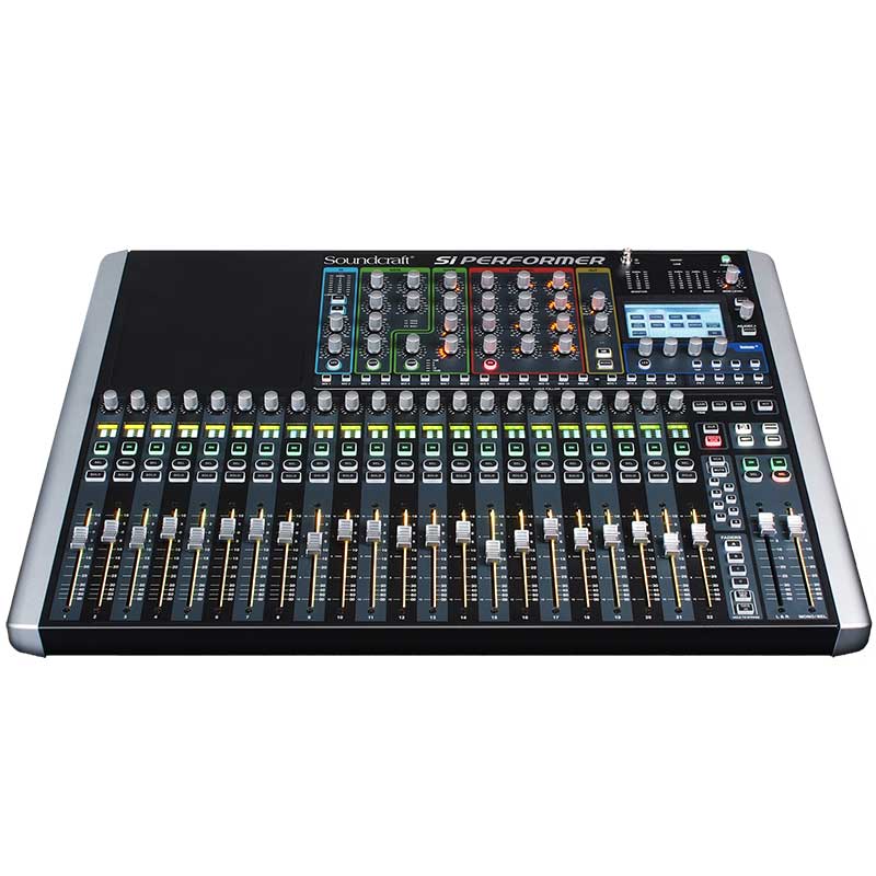 Drawing on the combined heritage of legendary Soundcraft quality and the powerful and intuitive Vi Series digital live sound mixers, the Si Performer brings unparalleled mix power and performance to small format digital live sound mixers. Sitting where a plethora of gear once was, the Si Performer delivers the equivalent of 448 rack units of DSP including sophisticated 4-band fully parametric EQ, full dynamics processing, a comprehensive range of output options, totally flexible routing and, as with all Soundcraft consoles, an unmatched range of options to fully integrate the Si Performer into an existing system or become the centre of a thriving new installation. The Si Performer also takes mixing out of the dark with powerful digital audio mixing facilities married to a DMX 512 controller allowing for the first time the mixing console to also run the lighting rig! 'Music & Lights; these have been partners in the entertainment and production industry since amplified sound met the electric light but until now even the simplest lighting setup would require a separate lighting controller console, road case and somewhere to put it; Soundcraft Si Performer changes everything. Empowering the console with a DMX interface, the Soundcraft Si Performer is able to utilize the power of motorised faders, Soundcraft FaderGlow™ and a console automation system to provide a flexible automated lighting controller ideal for schools, churches, touring theatre companies and conference productions.