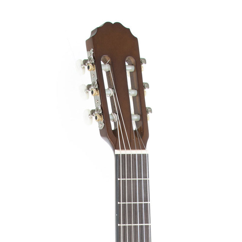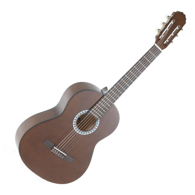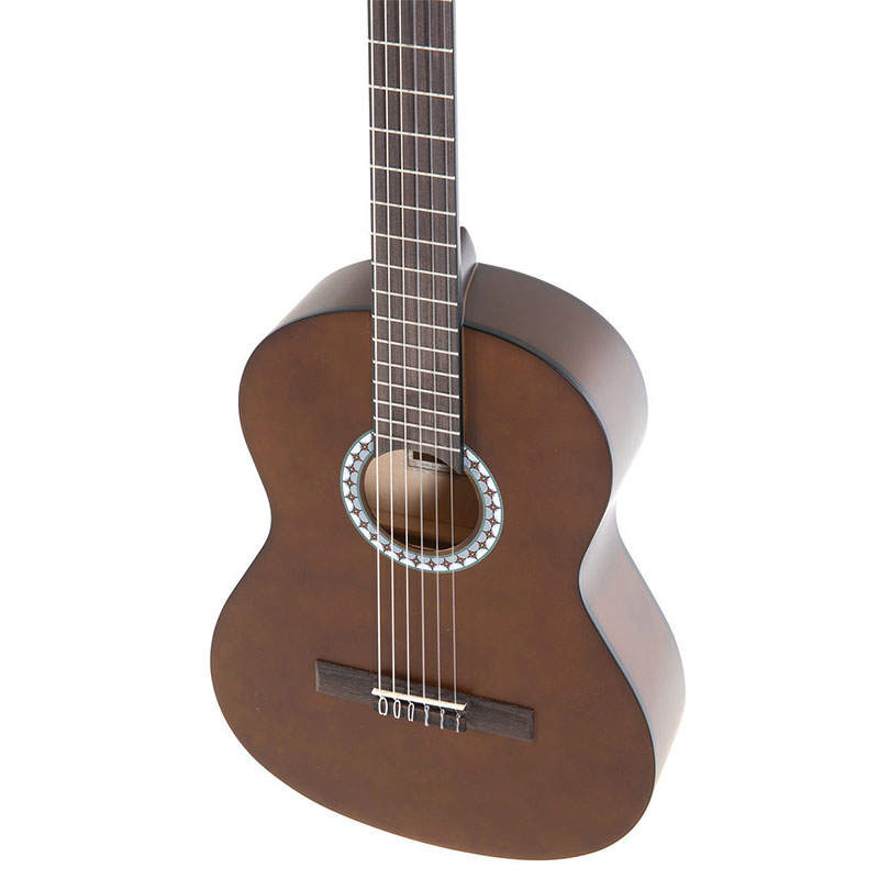 VGS Basic klasična gitara 3/4 Walnut PS510.140. Ova gitara 3/4 veličine je odličan izbor za mlađe početnike od 9 do 12 godina. Telo od lipe, ABS bordura, Pakka fretboard i kobilica, hromirane čivije. Dužina skale 590 mm, širine nuta od 47 mm. Izuzetno svirljiv instrument po neverovatnoj ceni. Idealna gitara za prve muzičke korake. Boja oraha u mat finišu.