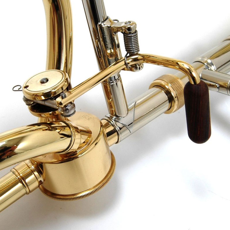 The Bach 50AG single rotor bass trombone features an 9-1/2" one-piece hand-hammered gold brass bell that has defined the symphonic sound for generations. The .562" large bore combined with the "Hagmann" valve and open wrap F attachment offers a warm sound, great projection, and an open feel. The chrome plated nickel silver inner handslide tubes provide the ideal surface for smooth and quick handslide action. The clear lacquer finish adds a subtle warmth to the sound overall. The Bach 50AG professional bass trombone is ideal for both symphonic and solo performance.