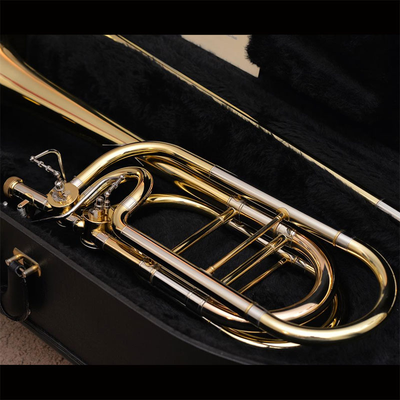 The Bach 50B3OG inline independent double rotor bass trombone in the key of Bb/F/Gb features an 9-1/2" one-piece hand-hammered gold brass bell that has defined the symphonic sound for generations. The .562" large bore combined with the open wrap F/Gb attachments offers outstanding clarity and projection with just less resistance. The chrome plated nickel silver inner handslide tubes provide the ideal surface for smooth and quick handslide action. The clear lacquer finish adds a subtle warmth to the sound overall. The Bach 50B3OG professional bass trombone is ideal for both symphonic and solo performance.