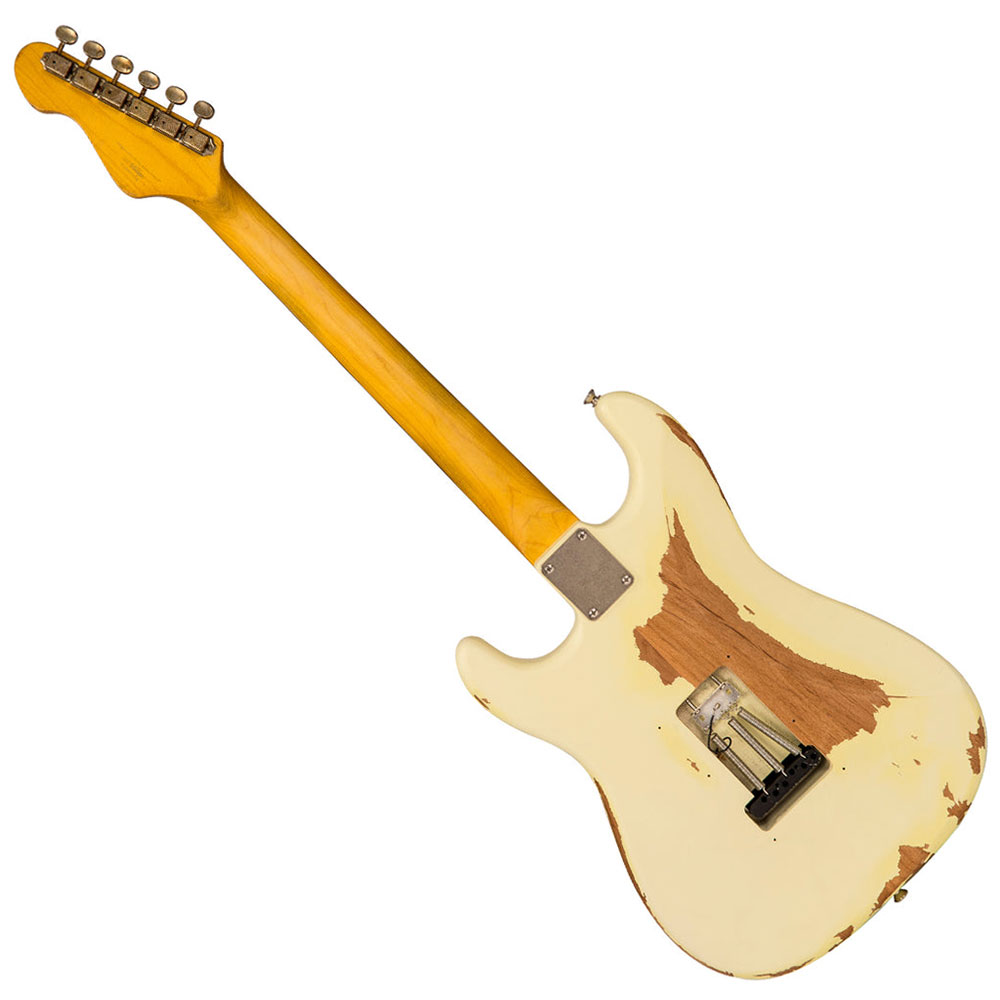 - V6MRTBG je primarno zamišljen kao radni instrument, bez previše ukrasa. Klasična, čvrsta osnovna konstrukcija, provereni i dokazani Wikinson hardware i elektronika, maksimalna upotrebljivost u svim situacijama. Telo od jove predstavlja pravi balans između umerene mase i jasnog, rezonantnog zvuka. Balansirani Wilkinson Alnico V single coil magneti omogućavaju prepoznatljivi ton koji se i očekuje od ovakvog instrumenta, uz odličan odnos snage i odziva. Srednji magnet sa kontra polaritetom potpuno neutrališe brum u drugoj i četvrtoj poziciji. Wilkinson WVC tremolo poseduje specijalno izbušeni sustain blok, bent steel sedla, i osim zvuka nudi i vrlo pouzdan, stabilan štim. Vrat od javora sa 21 medium pragom nosi udoban C profil, uz klasičan radijus od 7.5 inča. Standardno pouzdane Wilkinson WJ55 E-Z-LOK čivije i NuBone grafitni nudopunjuju listu kvaliteta koji se ne očekuju u ovom cenovnom rangu. V6MRTBTG dolazi u fabrički ,,relikovanom'' Vintage White finišu - za neodoljivi osećaj odavno usviranog instrumenta - pravo iz kutije!