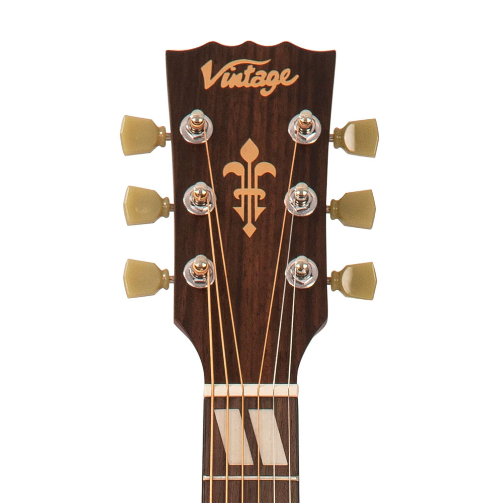Vintage VE160VSB akustična gitara je poznata po svojoj stabilnosti, brzini zvuka i ogromnom tonu. Sa Dreadnought telom od mahagonija i sa dodatnim ofsetom zvučne ploče od mahagonija sa zamršenom rozetom, popularna serija Vintage akustične gitare daje veoma impresivan izbalansiran zvuk.