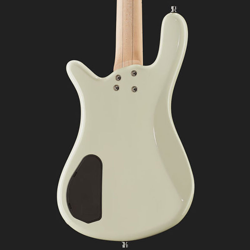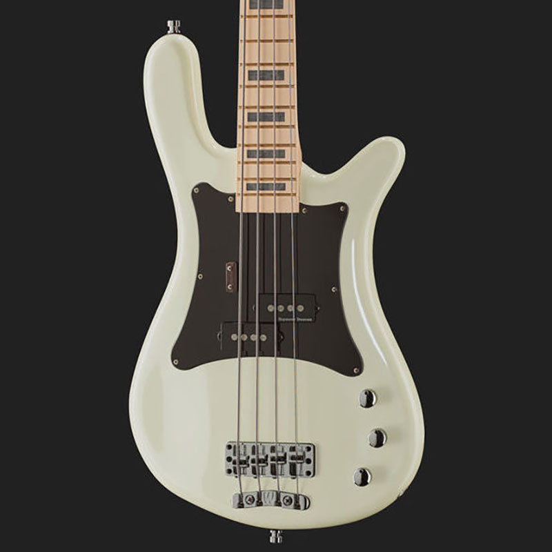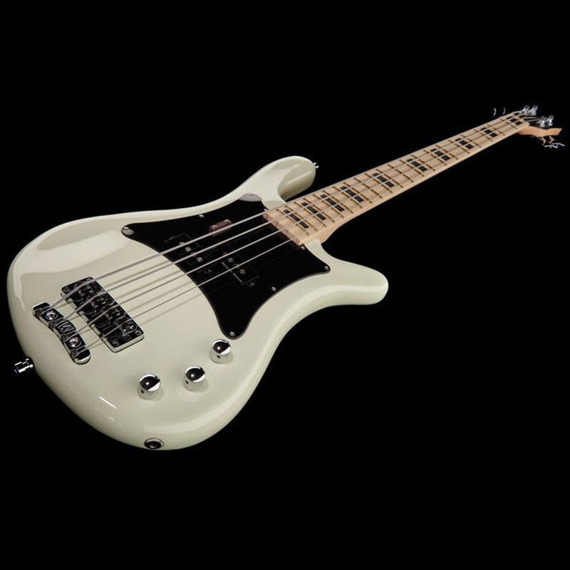 The Warwick RB Adam Clayton Signature features a Streamer style alder body with a Crème White high polish finish. Equipped with a Seymour Duncan P pickup and a 3 Knob configuration, the variety of tone and color are endless. The 34”-scale bolt-on Maple neck is topped with 21 Jumbo Bronze (extra hard) frets and beautiful black block-inlays.