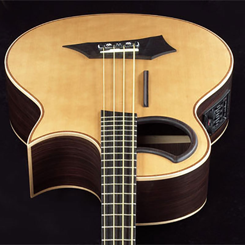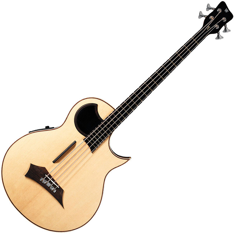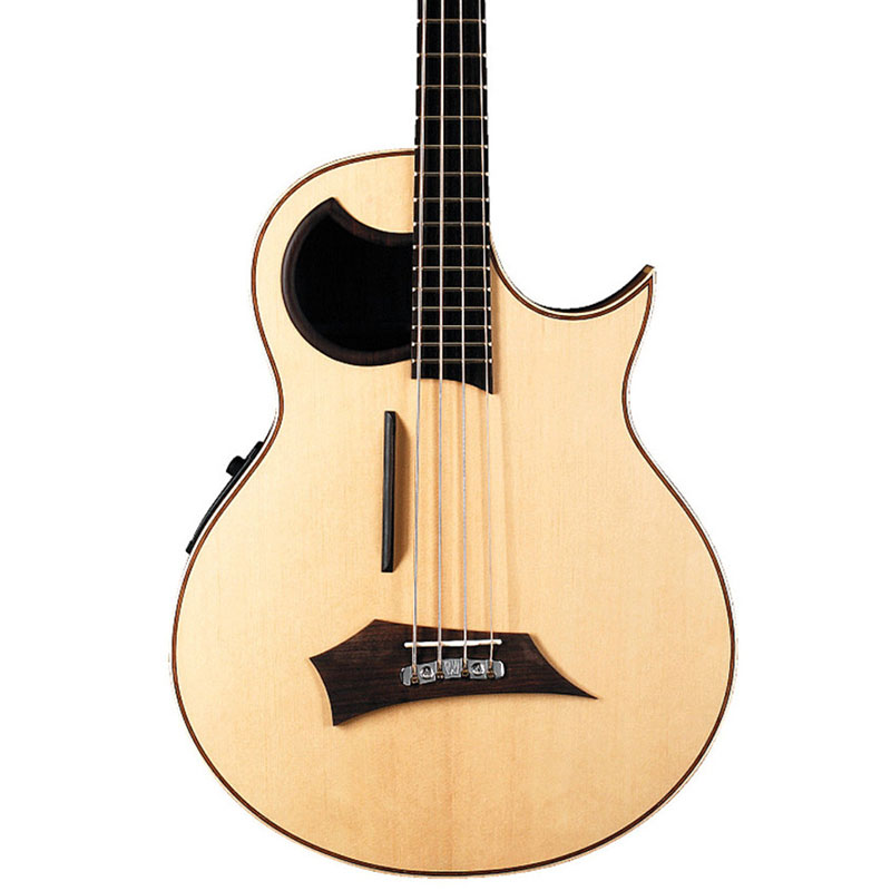 The Alien Acoustic bass sound can be classified between E and double bass. It allows a variety of expressive possibilities and expands the sonic palette immensely. The unusual design of the cutaway, the asymmetric soundhole also contribute to the uniqueness and the warm tones of this instrument. The tops and bottoms of the aliens are laminated to increase the stability. The design makes the bass great for stage use. Even without amplification, the sound of the alien is concise, dynamic and expressive, with a gruff tone and rich punch over the entire frequency range of the instrument. It is equipped with the Fishman Prefix Plus%u2122 system. There are many opportunities available to modulate the differentiated sound variable such as notch filter, phase reverse switch as well as controls for bass, treble, brilliance and semi-parametric contour working. A ''low battery'' indicator informs the player about a loss of capacity of the 9-volt power supply. The Alien Acoustic Bass is available as righthanded version (fretted and fretless) and as a lefthanded version (fretted & fretless).