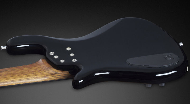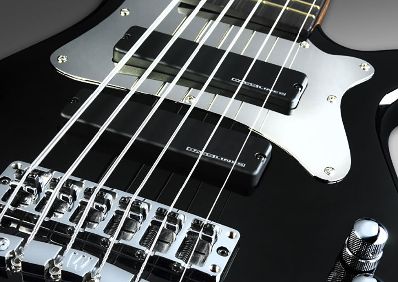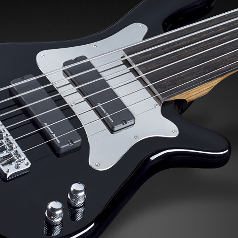 Steve Bailey Artist Series 6 is an extended range bass with a solid, double cutaway body made of swamp ash. Flat-top and equipped with a white plastic pickguard, the body of this bass features no top woods or bindings. As for color options, Steve Bailey models feature uniform black color with gloss finish. The ovangkol neck is attached to the body with a bolt-on joint and topped with a tigerstripe ebony fingerboard. 24 frets and Just A Nut III string nut complete the fingerboard. Pickups on Steve Bailey Artist Series 6 are active Seymour Duncan soapbars. These pickups replace the regular singles found on four-stringed models of the series. Active Seymour Duncan electronics accompany these pickups. The bridge on this, as well on all other Steve Bailey models, is a Warwick two-piece with chrome plating.