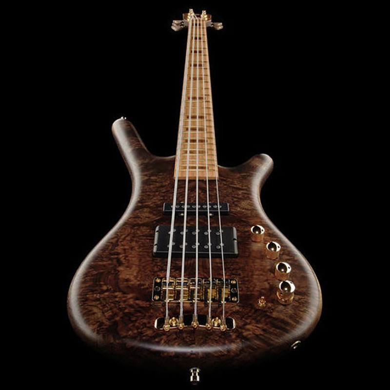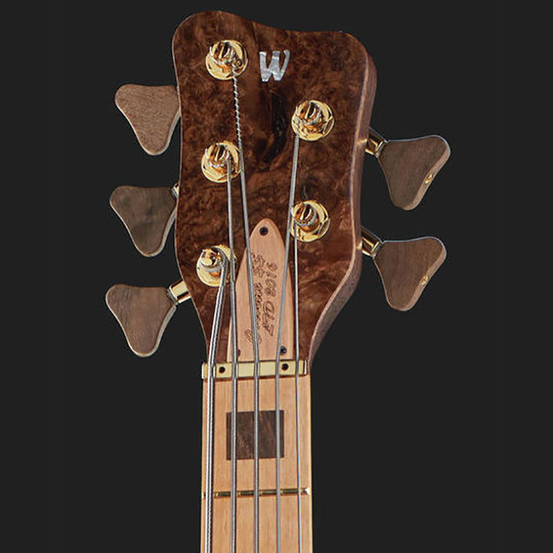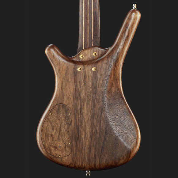 Other features include Warwick machine heads with wooden knobs, black walnut burl block fretboard inlays, fluorescent side dots, and 24 jumbo bronze frets with Invisible Fretwork Technology. The pickups are configured with a Nordstrand J Pickup in the neck position and a Nordstrand Bigman pickup at the bridge. The Bigman has a coil-split switch and both pickups feed into an active Nordstrand 2-band preamp.