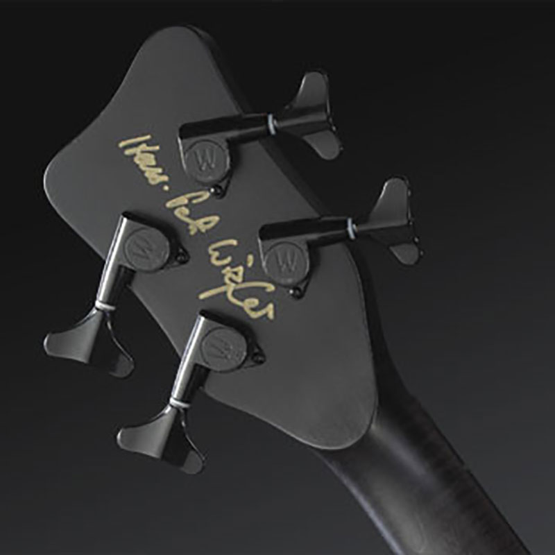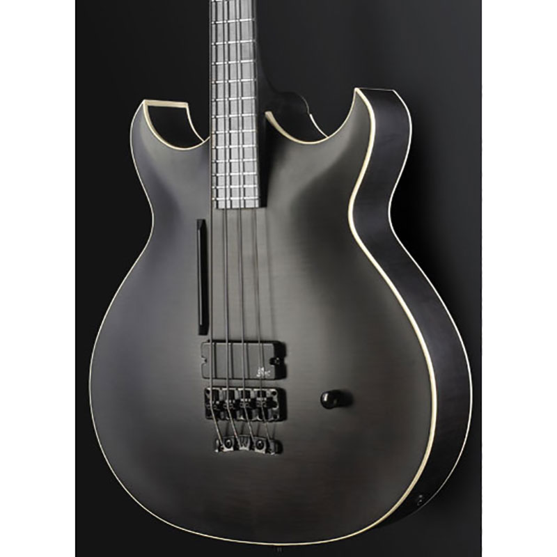 This archtop set neck bass with double cutaway is dedicated to a great Jazz musician, the Swede Jonas Hellborg, who, like almost no one else, masterfully combines Eastern music traditions with Western. The construction of this bass is distinguished by a hollow body, the arched back and top, as well as the sides are made of AAA Flamed Maple. The front and back side of the body is bound with cream/black celluloid . A Tigerstripe Ebony fingerboard is glued to the AA Flamed Maple neck. The double cutaway offers easy playing in the upper neck positions. The passive, low impedance MEC Soapbar singlecoil humcancelling pickup is matched to the active 18V electronics with a matching transformer. The single volume pot contains a push pull switch that in the up position connects the matching transformer directly to the trs output jack for low impedance balanced operation. In this mode the bass needs to be connected direct to a mic pre amp. At the trussrod cover is the signature of Jonas Hellborg, and on the rear side of the headstock his signature is also engraved.