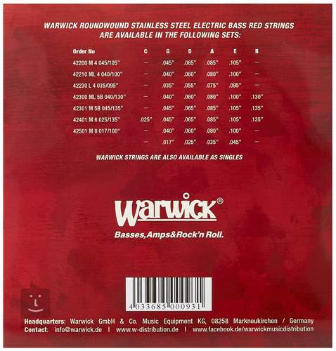 Warwick Red 46230 M žice za bas je komplet četvorožičanu bas gitaru. Žice su od niklovanog čelika, sa heksagonalnim jezgrom. Debljina .035", .055", .075", .095", medium tenzije.