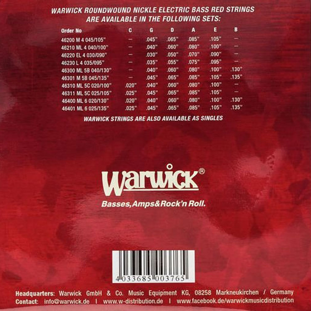 Warwick Red 46401 M 6 žice za bas je komplet za šestožičanu bas gitaru. Žice su od niklovanog čelika, sa heksagonalnim jezgrom. Debljina .025", .045", .065", .085", .105", .135", medium tenzije.