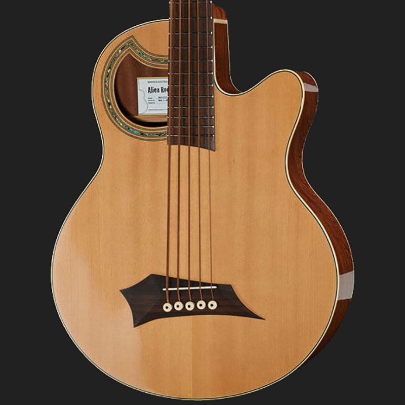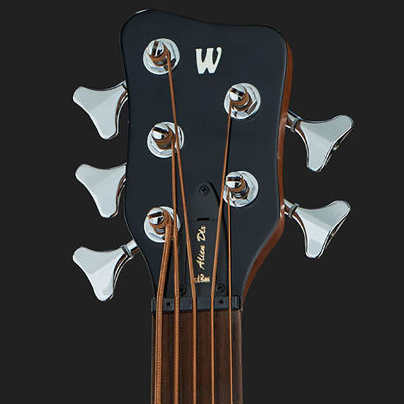 The RockBass Alien Deluxe features a spruce top and bubinga body that are both laminated for increased durability in stage use. Warwick high quality precision tuners have a 20:1 ratio and feature a sealed, self-lubricating gear that warrants high tuning stability and needs no maintenance. The tuners are installed slanted facing the player to improve ergonomics and handling. The turning resistance of the tuners can be adjusted using a screwdriver. The Just A Nut III is manufactured using high-tech material with the best tonal characteristics, fine adjustability and stability. The Warwick 3-D Bridge features individual string saddle adjustments for intonation, string spacing, as well as height. All RockBass models are equipped with pickups by German manufacturer MEC (Music Electronic Company) exclusively.