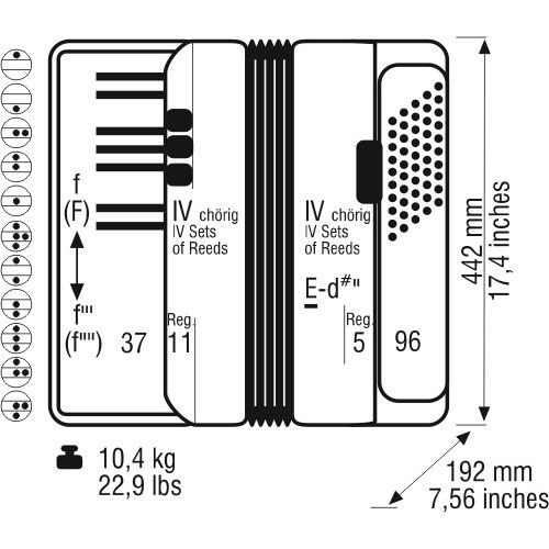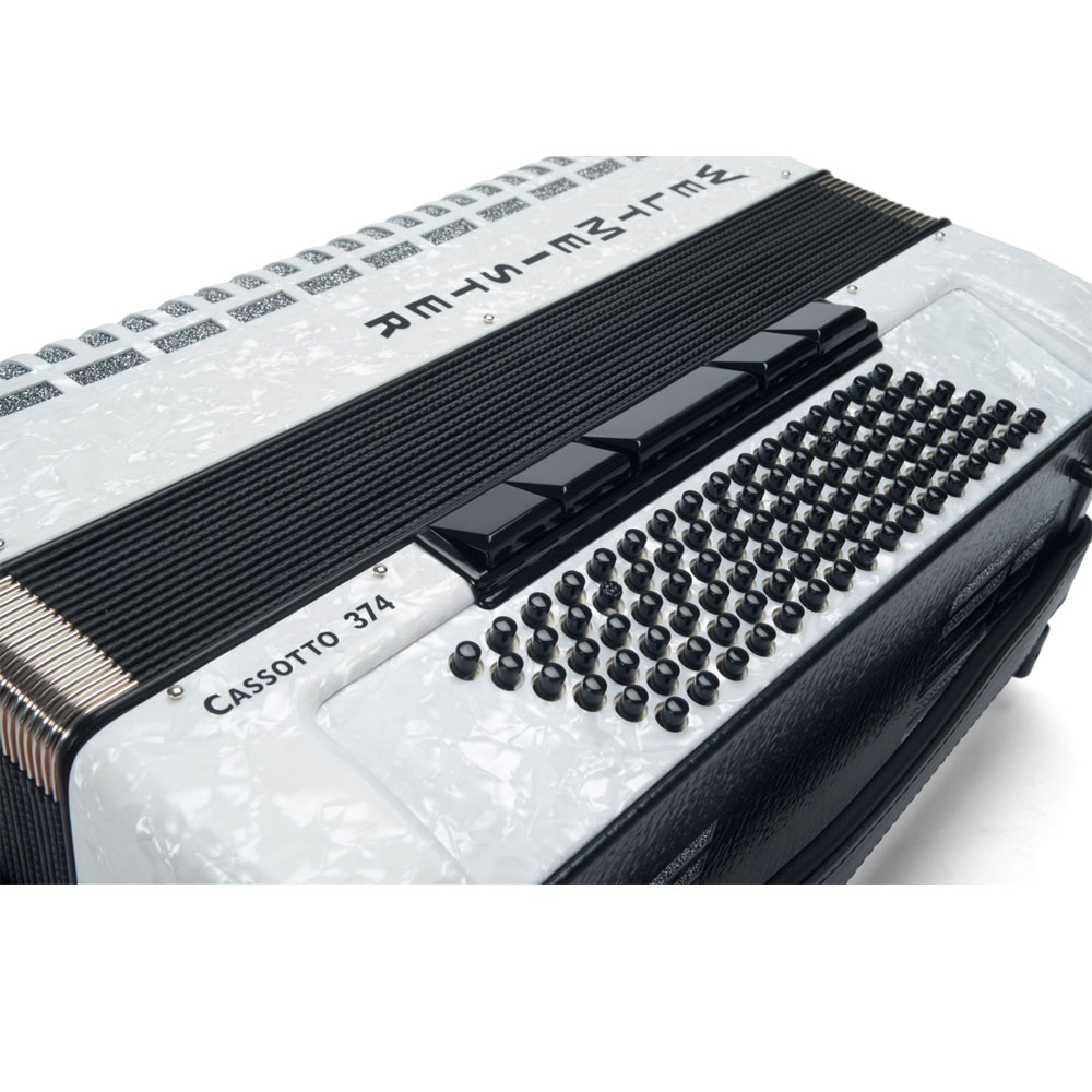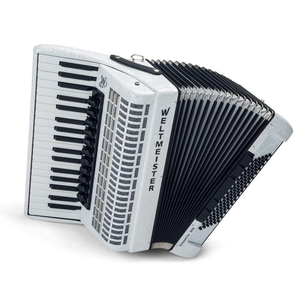 Weltmeister Cassotto 374 klavirna harmonika sa 96 basova je vrhunska harmonika koja odgovara svim potrebama muzičara. Izrađena od visoko kvalitetnih materijala sa vrhunskom mehanikom i dirkama sa drvenom osnovom, ova harmonika će pružati fenomenalan ton. Topao, moćan zvuk podržan sa jakim basovima daje ovoj harmonici kompletan i zaokružan tonski kvalitet. Kombinuje sve mogućnosti Cassotto harmonika sa manjom težinom u odnosu na standardne instrumente. Poseduje cassotto zvučnu komoru koja daje stabilan i moćan ton i drugačiju vibraciju.