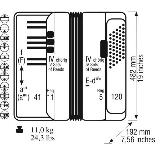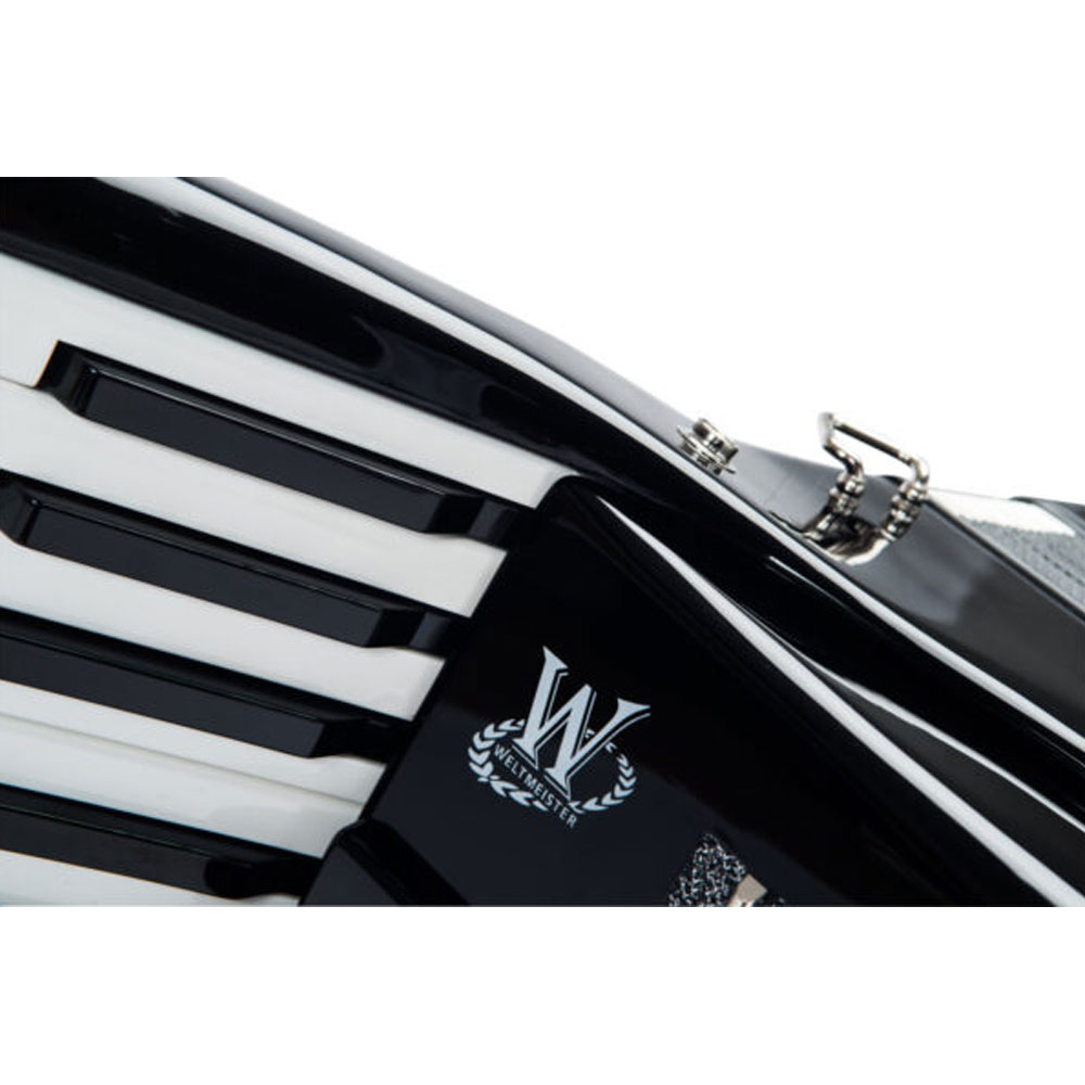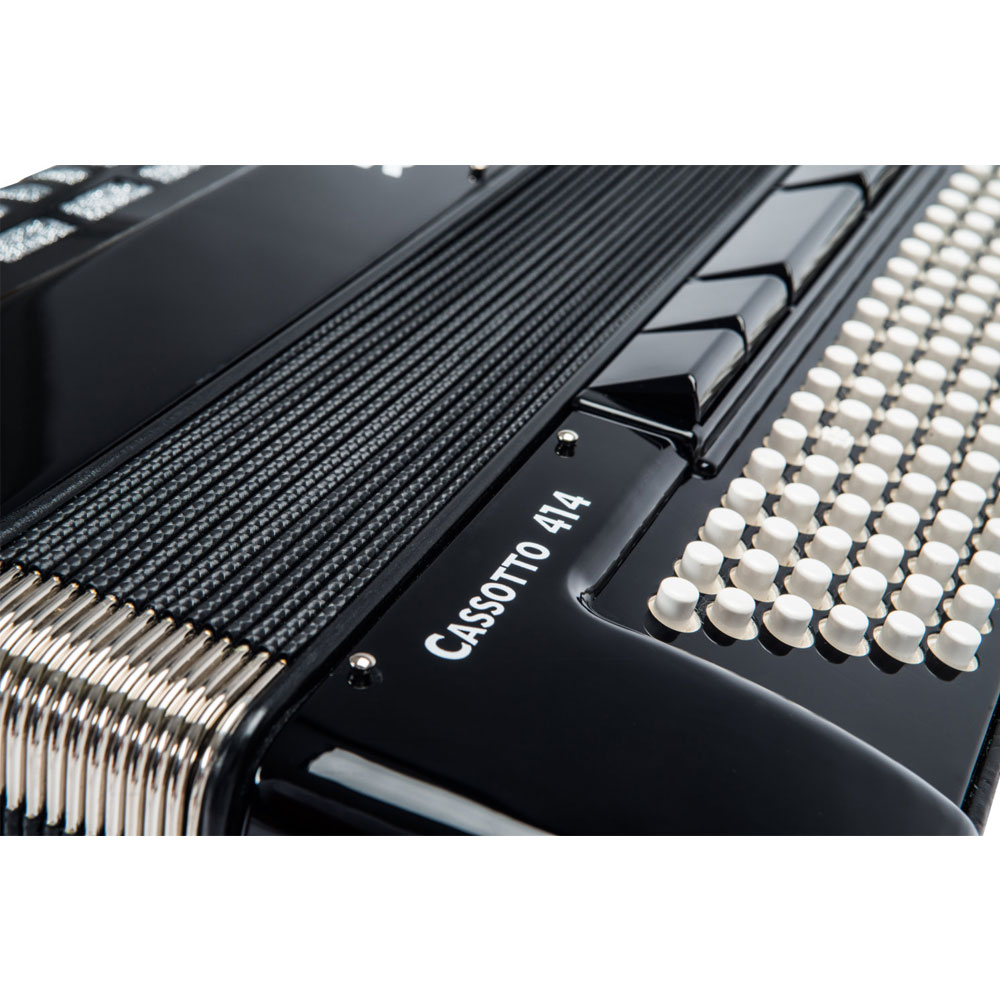 Weltmeister Cassotto 414 klavirna harmonika sa 120 basova je vrhunska harmonika koja odgovara svim potrebama muzičara. Izrađena od visoko kvalitetnih materijala sa vrhunskom mehanikom i dirkama sa drvenom osnovom, ova harmonika će pružati fenomenalan ton. Topao, moćan zvuk podržan sa jakim basovima daje ovoj harmonici kompletan i zaokružan tonski kvalitet. Kombinuje sve mogućnosti Cassotto harmonika sa manjom težinom u odnosu na standardne instrumente. Poseduje cassotto zvučnu komoru koja daje stabilan i moćan ton i drugačiju vibraciju.
