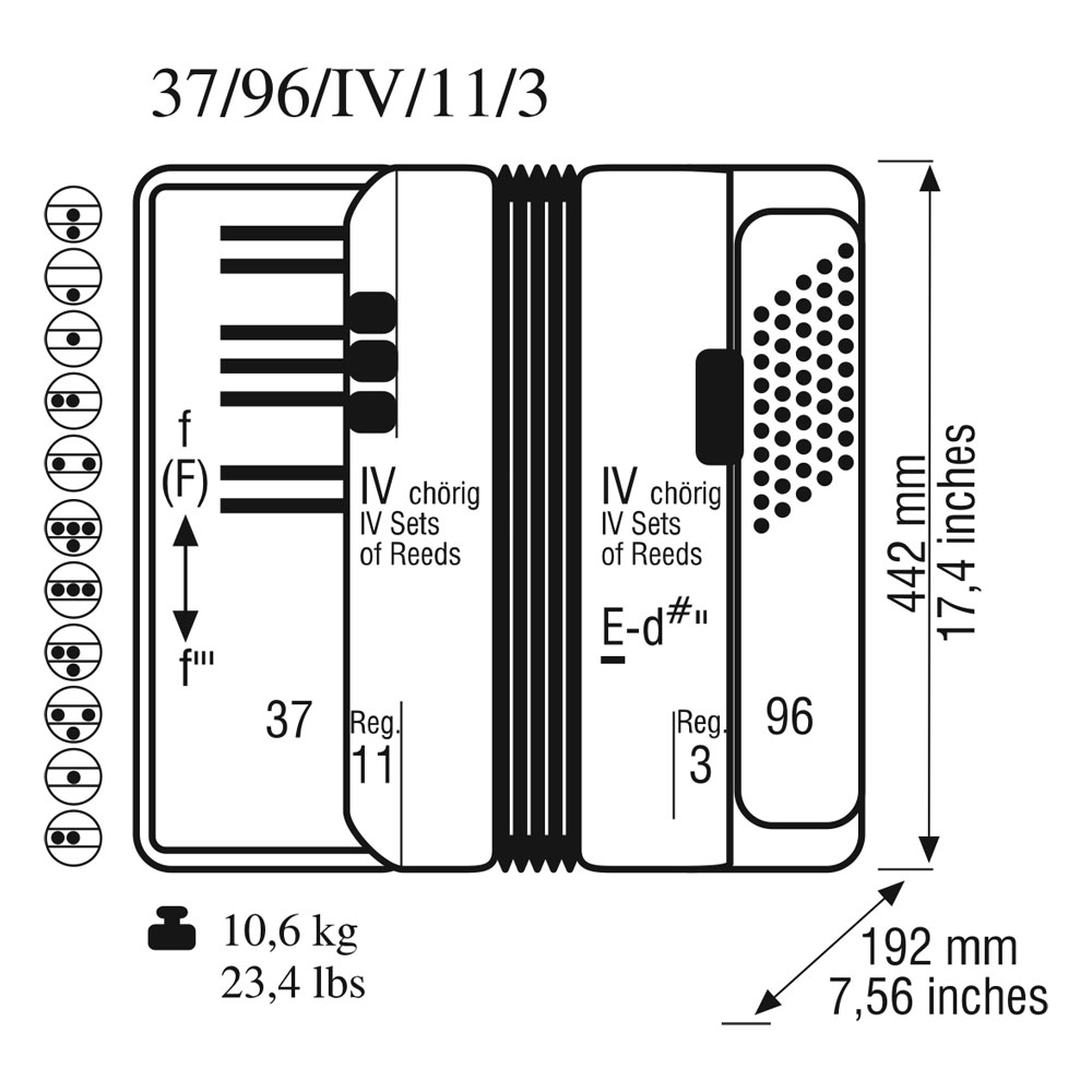 - Harmonika poseduje 37 dirku i 96 basova i dolazi u kompletu sa koferom i kaiševima.