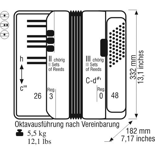 - Desna ruka: 26 dirki, tri registra, dvoglasna