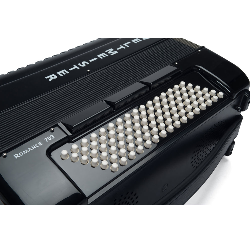 Weltmeister Romance 703 harmonika dugmetara sa 96 basova je vrhunska harmonika koja odgovara svim potrebama muzičara. Izrađena od visoko kvalitetnih materijala sa vrhunskom mehanikom ova harmonika će pružati fenomenalan ton. Topao, moćan zvuk podržan sa jakim basovima daje ovoj harmonici kompletan i zaokružan tonski kvalitet. Pogodan je za školsku upotrebu, kao i za binu.