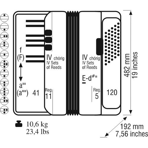 Weltmeister Saphir klavirna harmonika sa 120 basova i 41 dirki. Desna i leva ruka četvoroglasne.