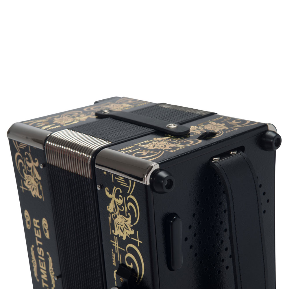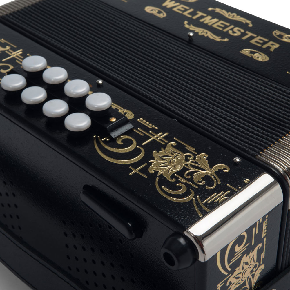 Weltmeister Wiener 86W harmonika sa 8 basova je vrhunska harmonika koja odgovara svim potrebama muzičara. Crna baza sa zlatnim ukrasima i zakrivljenim ivicama čine ovaj mali instrument jedinstvenim.