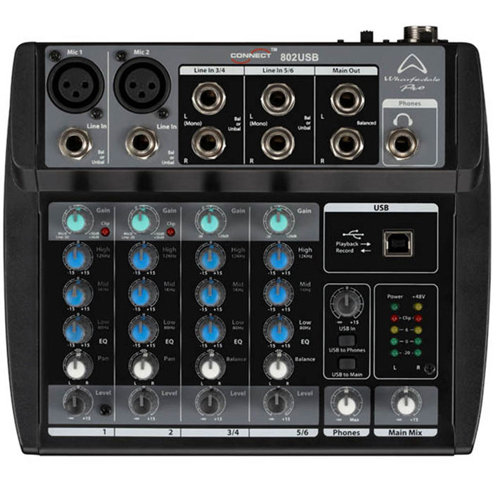 Mikro mikseta iz Wharfedale Connect serije sa dva balansirana XLR mikrofonskim i 6 stereo ulaza, phantom napajanjem, level/clip indikatorima, pan/balance kontrolama... Pogodna za manji kućni studio ili manju svirku.
