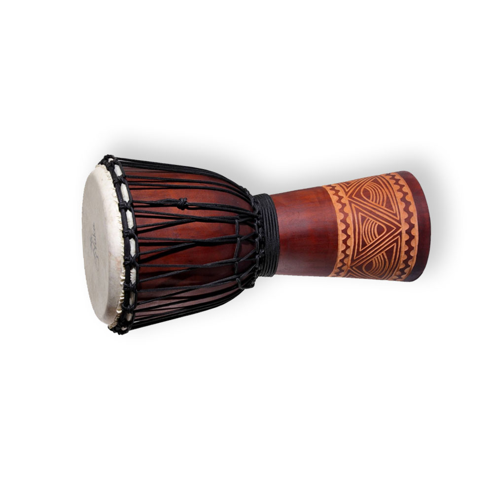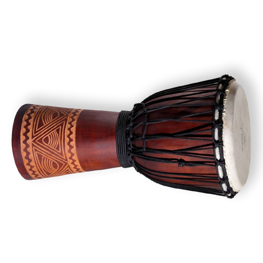 YUKA DJWN010-20BR2 Wooden Jammer 10" đembe srednje veličine, izrađeno od jednog komada mahagonija, s opnom od kozje kože. Sila zatezanja opne podešava se pomoću najlonskog užeta provučenog kroz metalne prstenove. Telo je smeđe boje, ukrašeno izrezbarenim ručno izrađenim etno ornamentom.