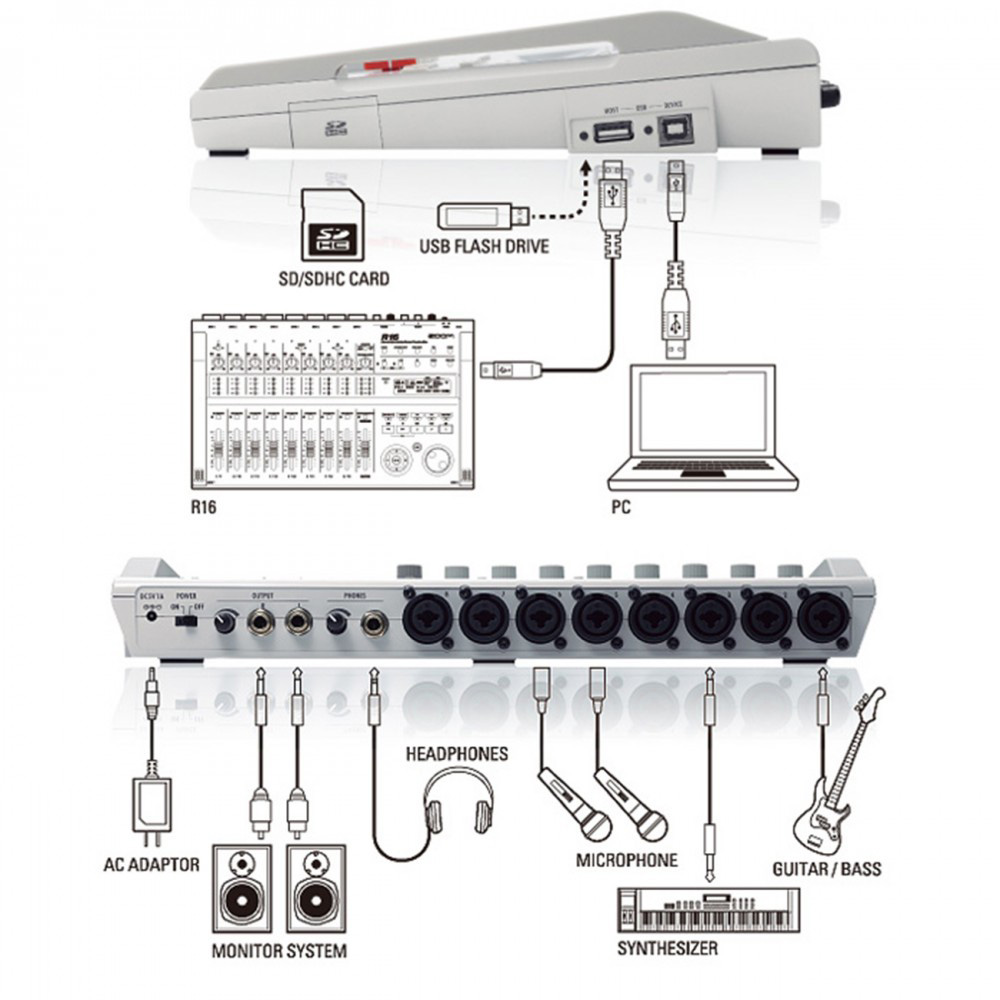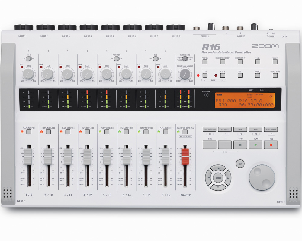 Zoom R16 svako okruženje pretvara u portabl studio za snimanje muzike! R16 poseduje 8 kombinovanih XLR/Linijskih ulaza u koje se može u istom trenutku uključiti bilo mikrofoni bilo instrumenti poput bas gitare, ritam mašine ili bilo koji drugi instrument koji poseduje linijski izlaz u WAV formatu. Poseduje mogućnost napajanja putem strujnog adaptera ili putem baterija. Nakon snimanja, R16 može da se koristi kao mikser koristeći postojeće reglere, ekvilajzer ili banku od 135 DSP efekata, uključujući i efekte i kompresor za master.